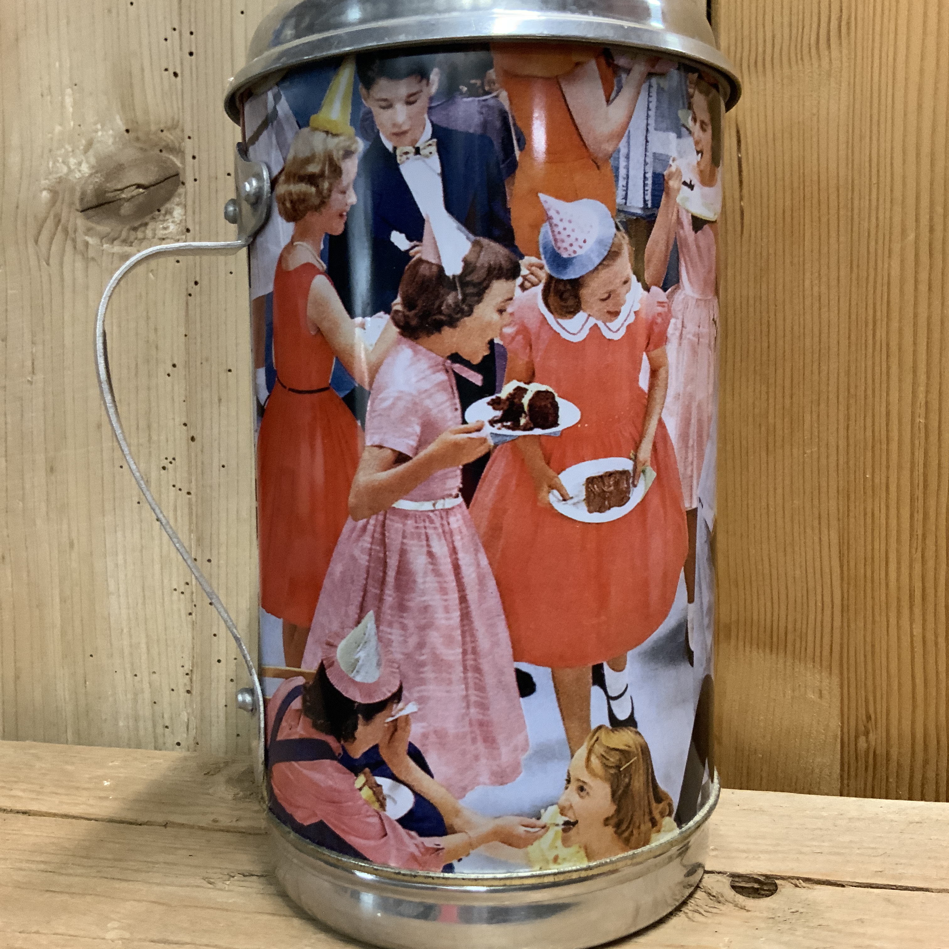 Een vintage thermoskan met als thema VERJAARDAG. Vooral de decoratie is prachtig. De glazen fles zit er nog heel in. De kurk ontbreekt. Maar als decoratief item prachtig!