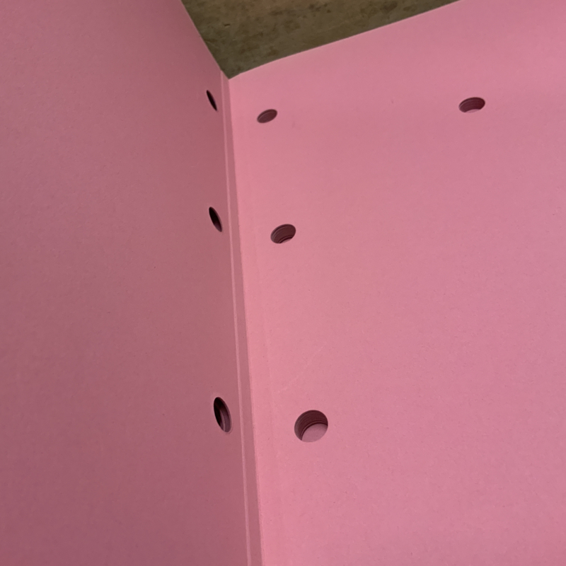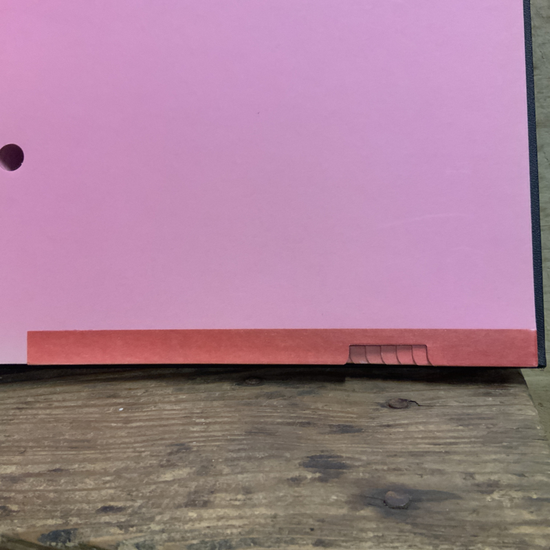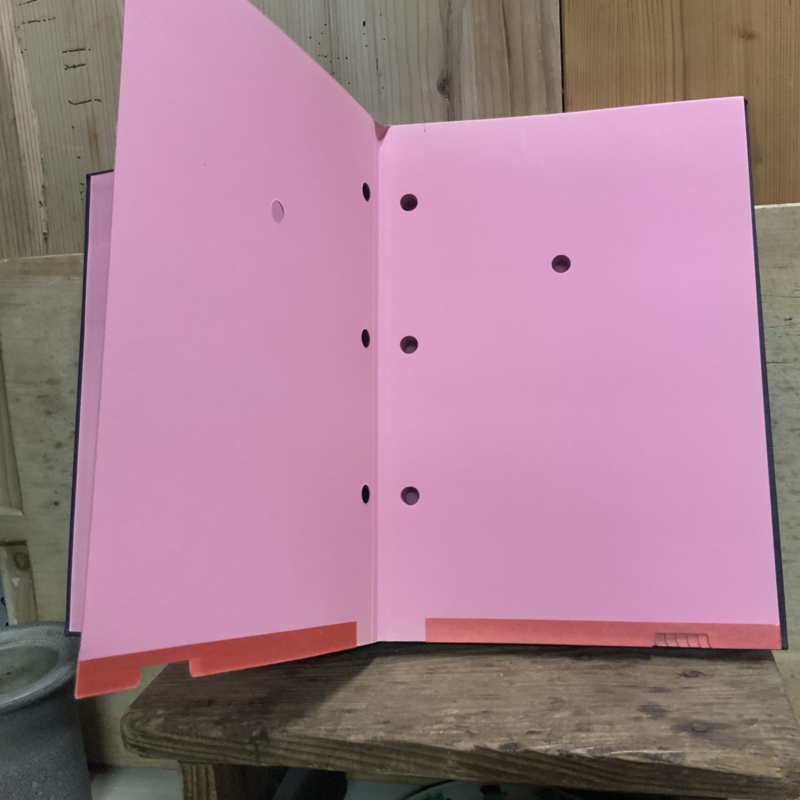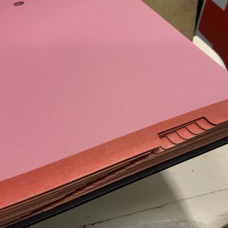 Een map om belangrijke documenten in te bewaren. Door de gaatjes in de bladen wordt het document , als het ware, vast gezogen en waait het niet uit de map.