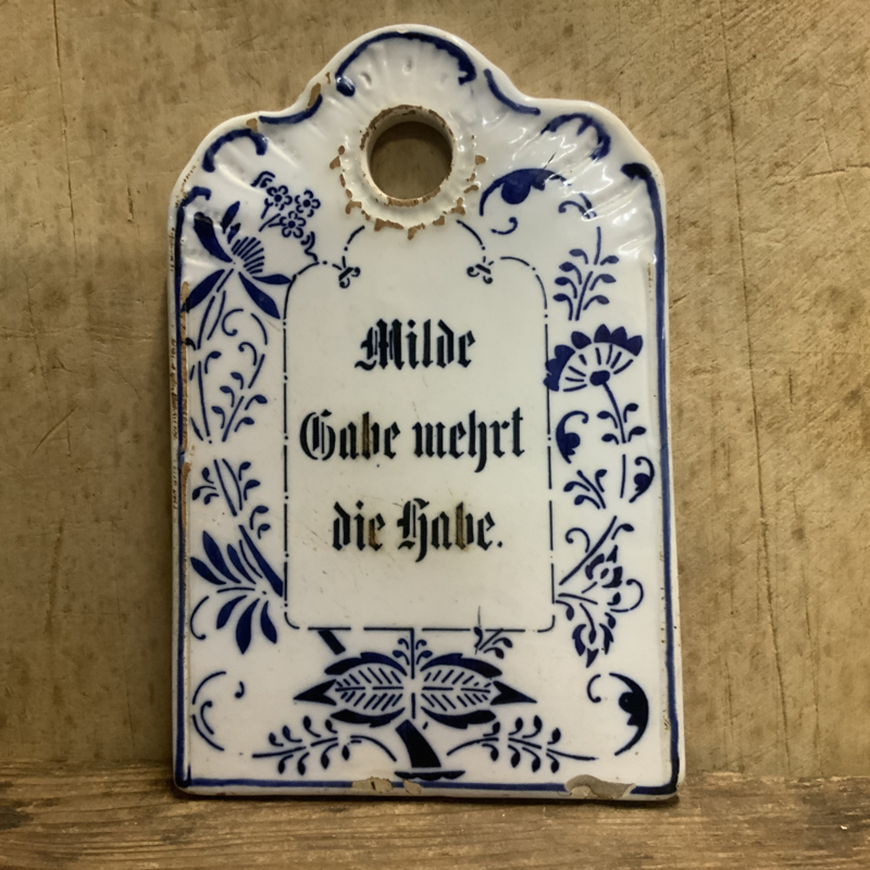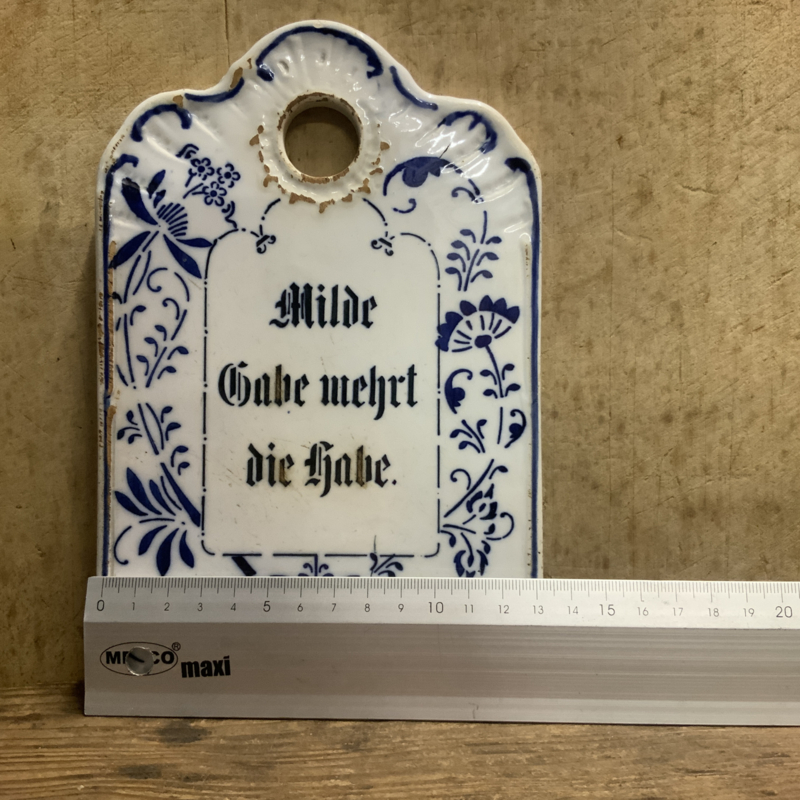 MILDE GABE MEHRT DIE HABE; een Duitse spreuk op een antiek ontbijtplankje. Mooi verweerd ( zie foto's)