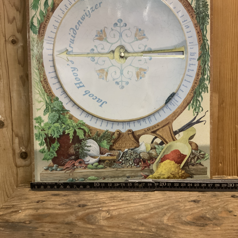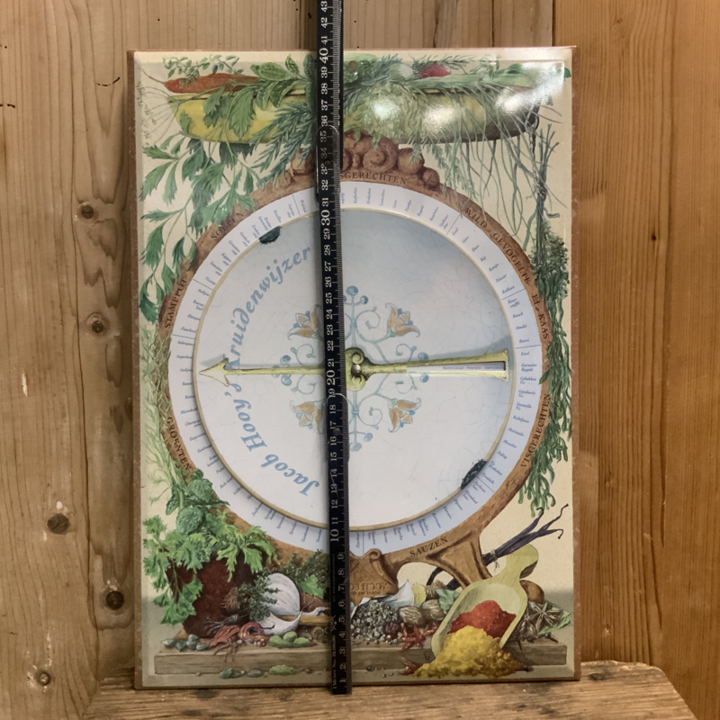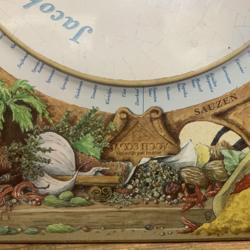 Een retro kruidenwijzer van Jacob Hooy van metaal.