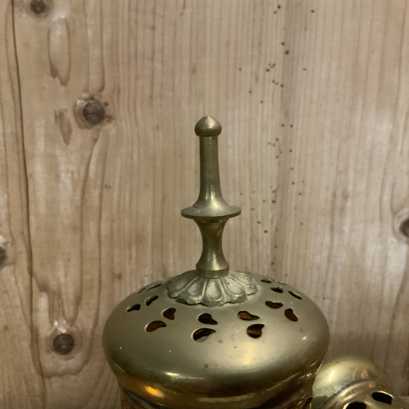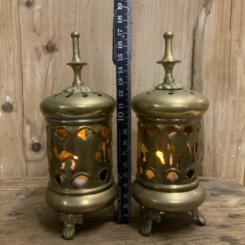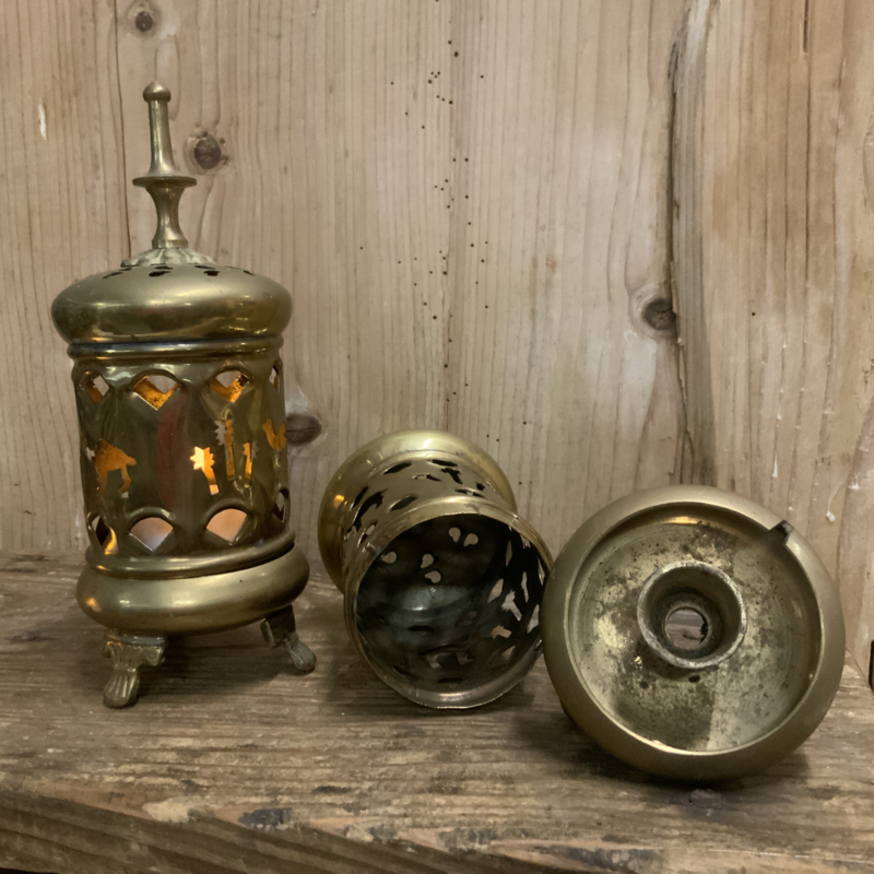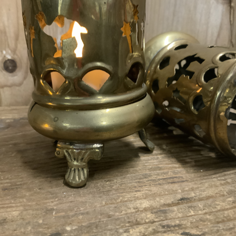 Een set messing lantaarntjes. Ik heb er een waxinelichtje ingedaan voor de foto maar er zit een hoider voor een kaarsje in. Beide mogelijk dus. De bovenkant kan er afgedraaid worden.