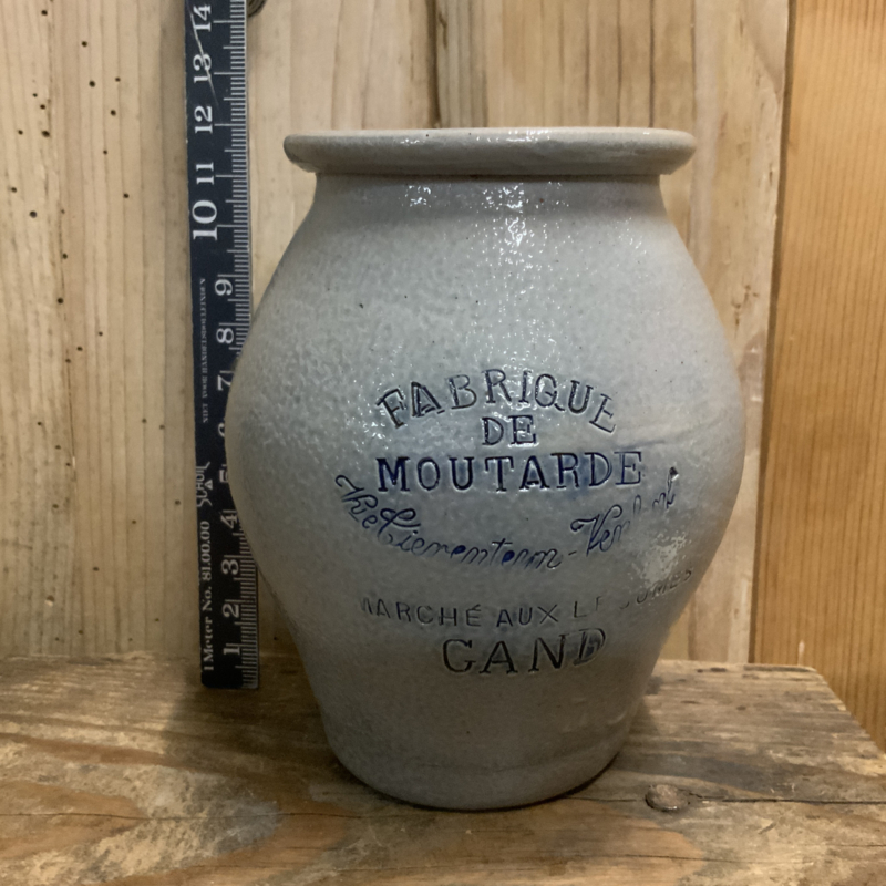 Een vintage Belgische mosterdpot uit Gent. Mooi blauw glazuur met blauwe naamsstempel