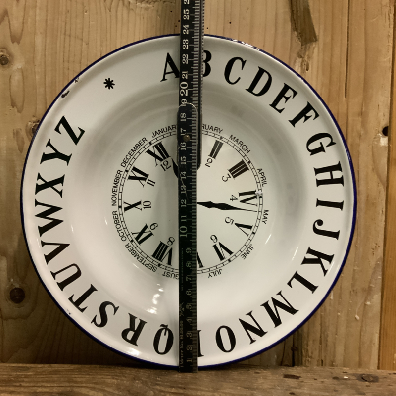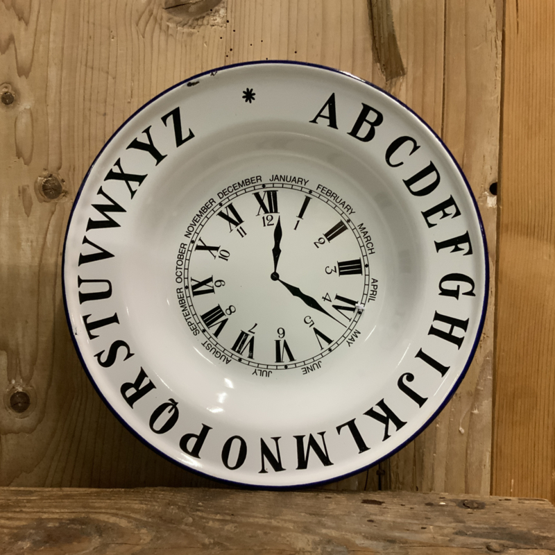 Een emaille bord met een KLOK decoratie, het alfabet op de rand. Aan de achterkant: