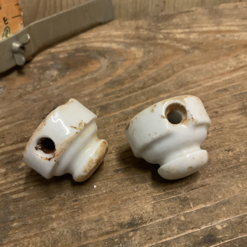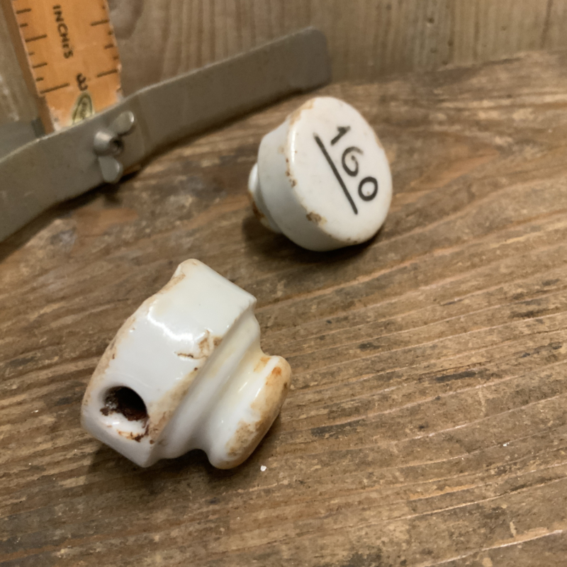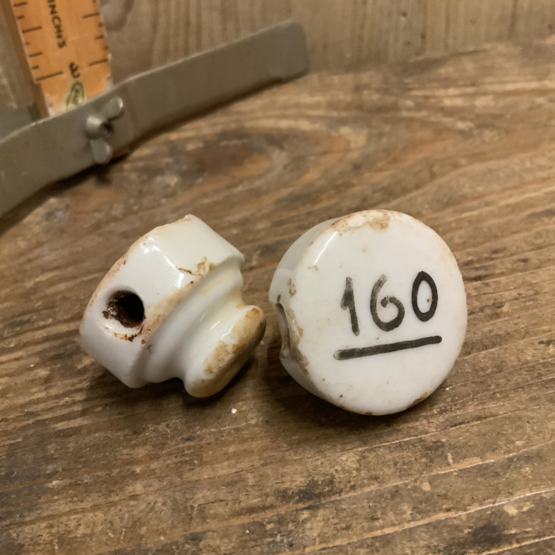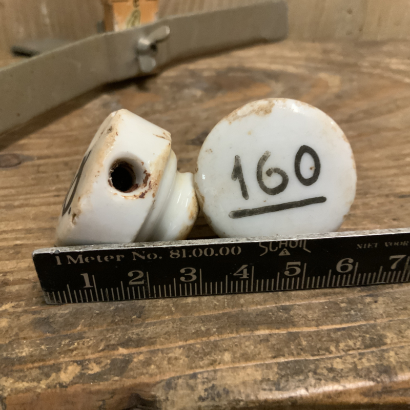 Set van 2 porseleinen doppen van een beugelfles. Op beide staat een nummer. 160 en 58.