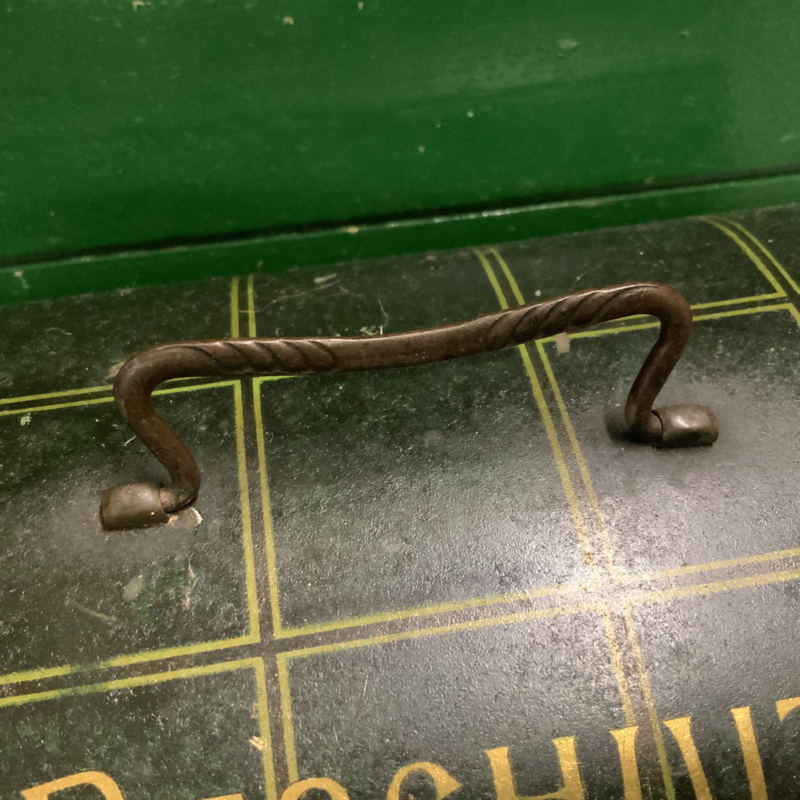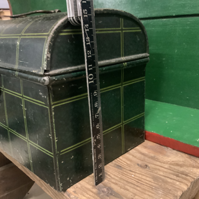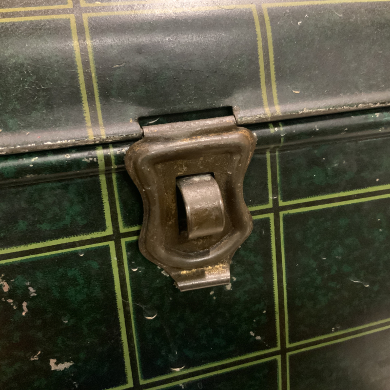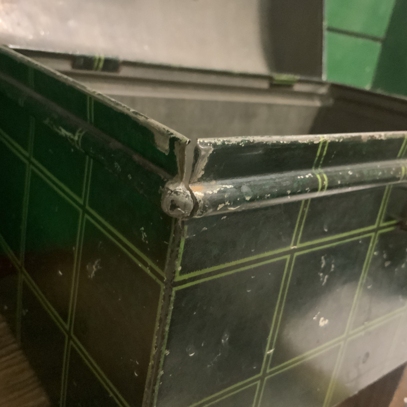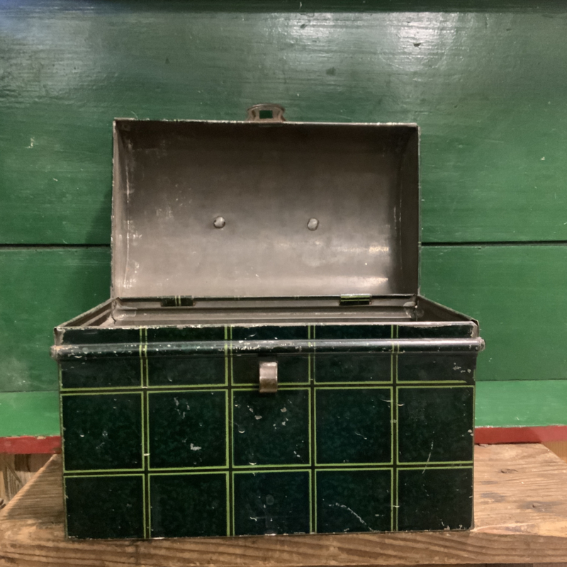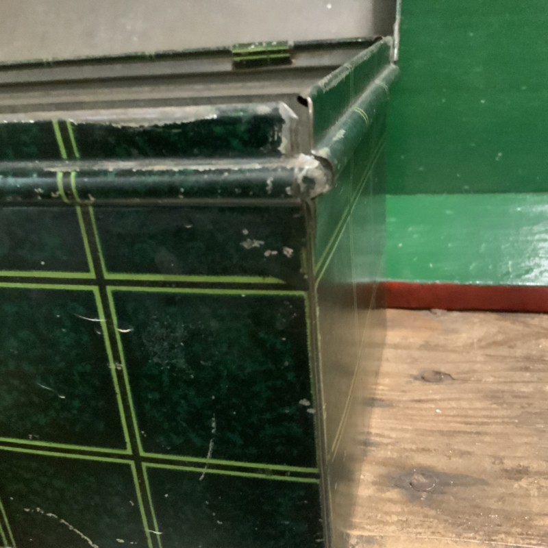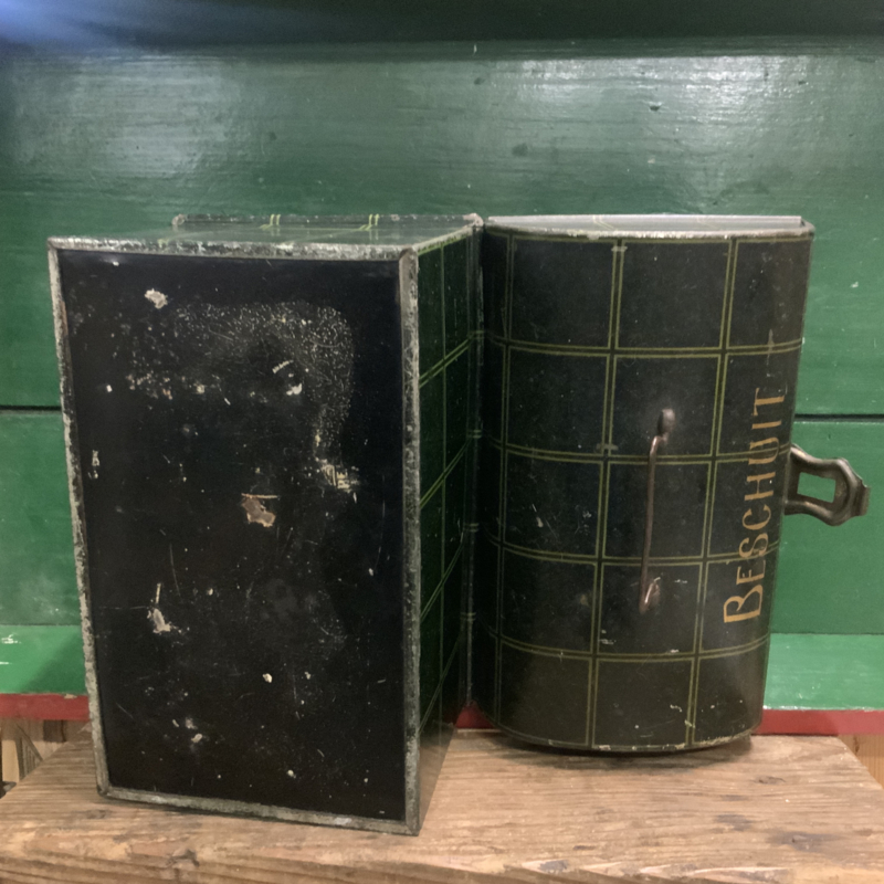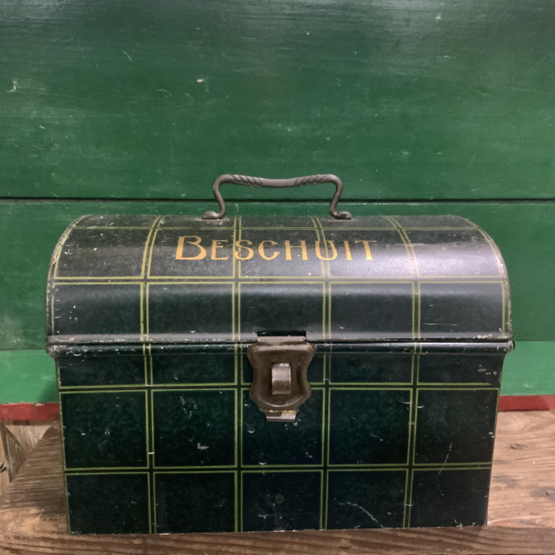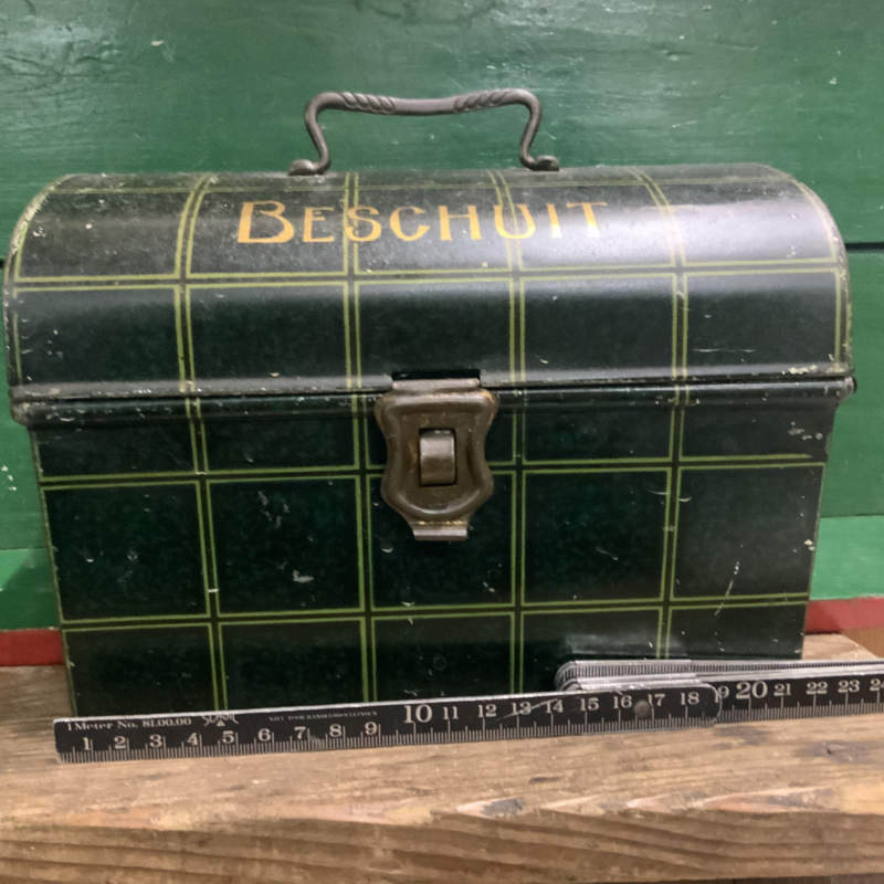 Een hele oude trommel ( gemaakt rond 1950) met opschrift BESCHUIT. Groen geblokt. Bijzonder decoratief
