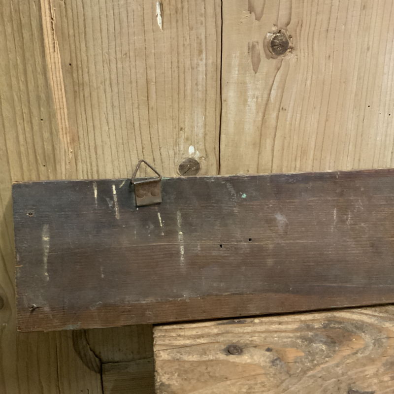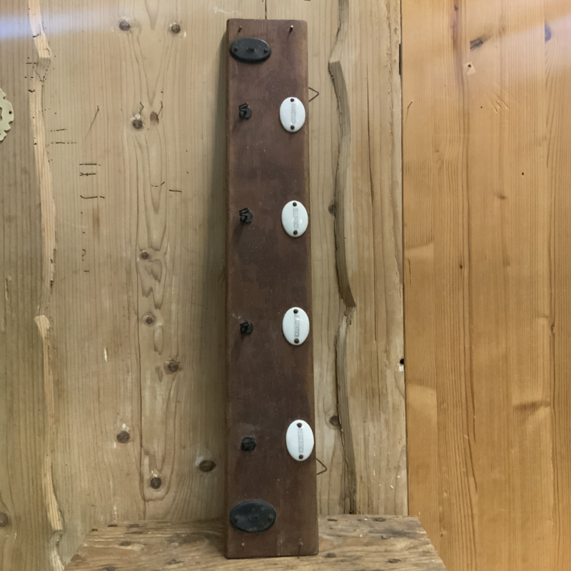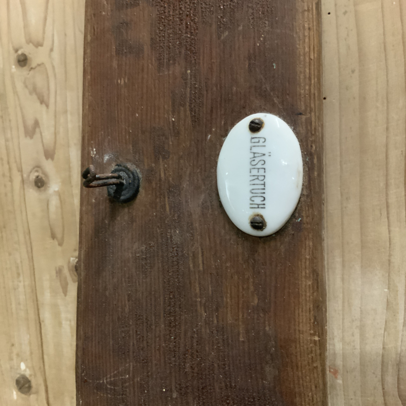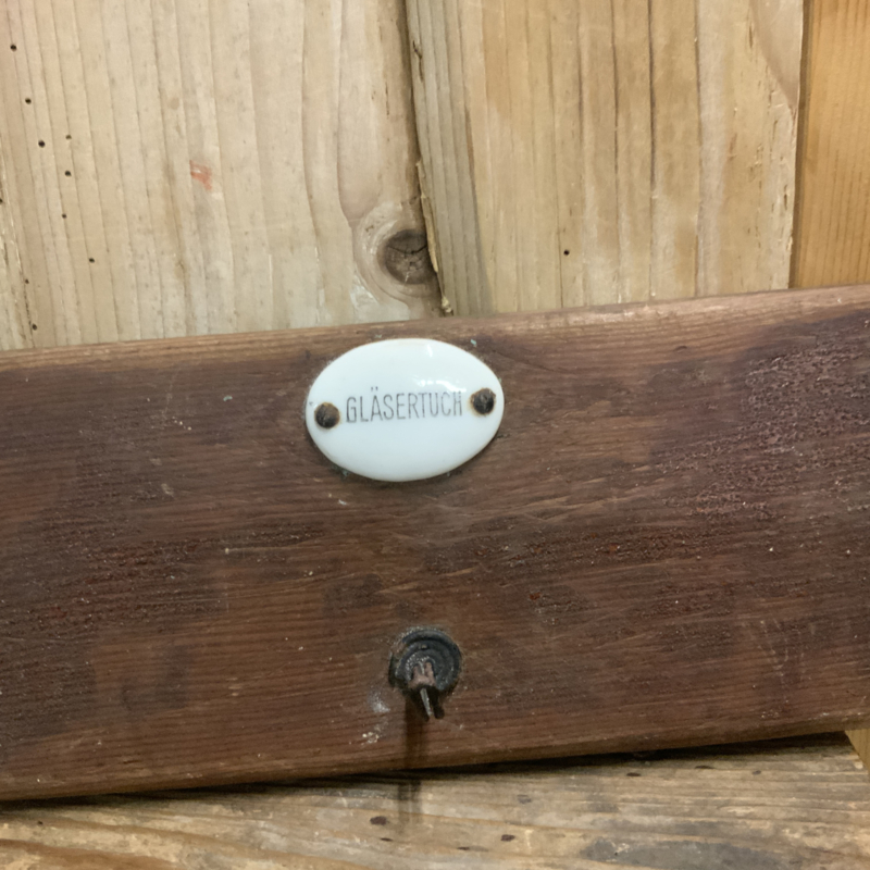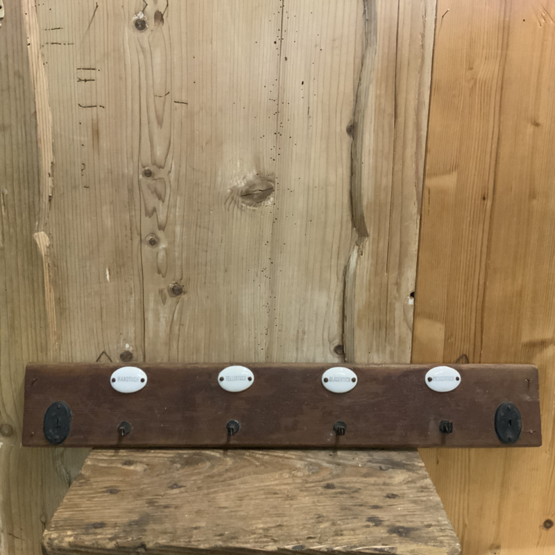 Een Duits, brocante rekje voor in de keuken. Porseleinen plaatjes geven aan waar de handdoek enz. hoorde te hangen. Het rekje heeft een brocante uitstraling.