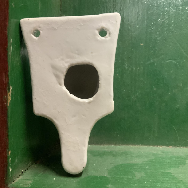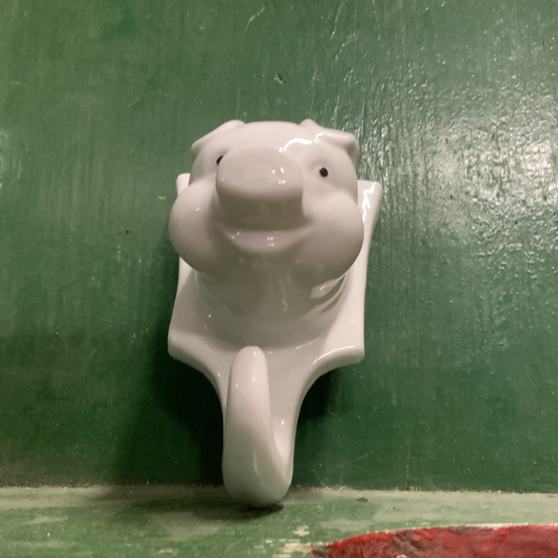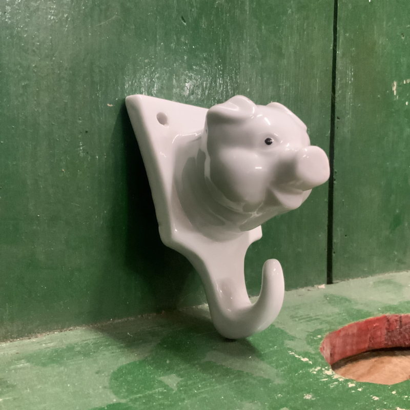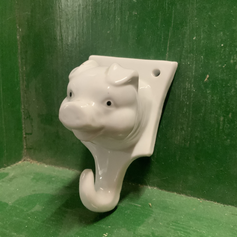 Een porseleinen haakje met varkenskop. Grappig in de keuken.